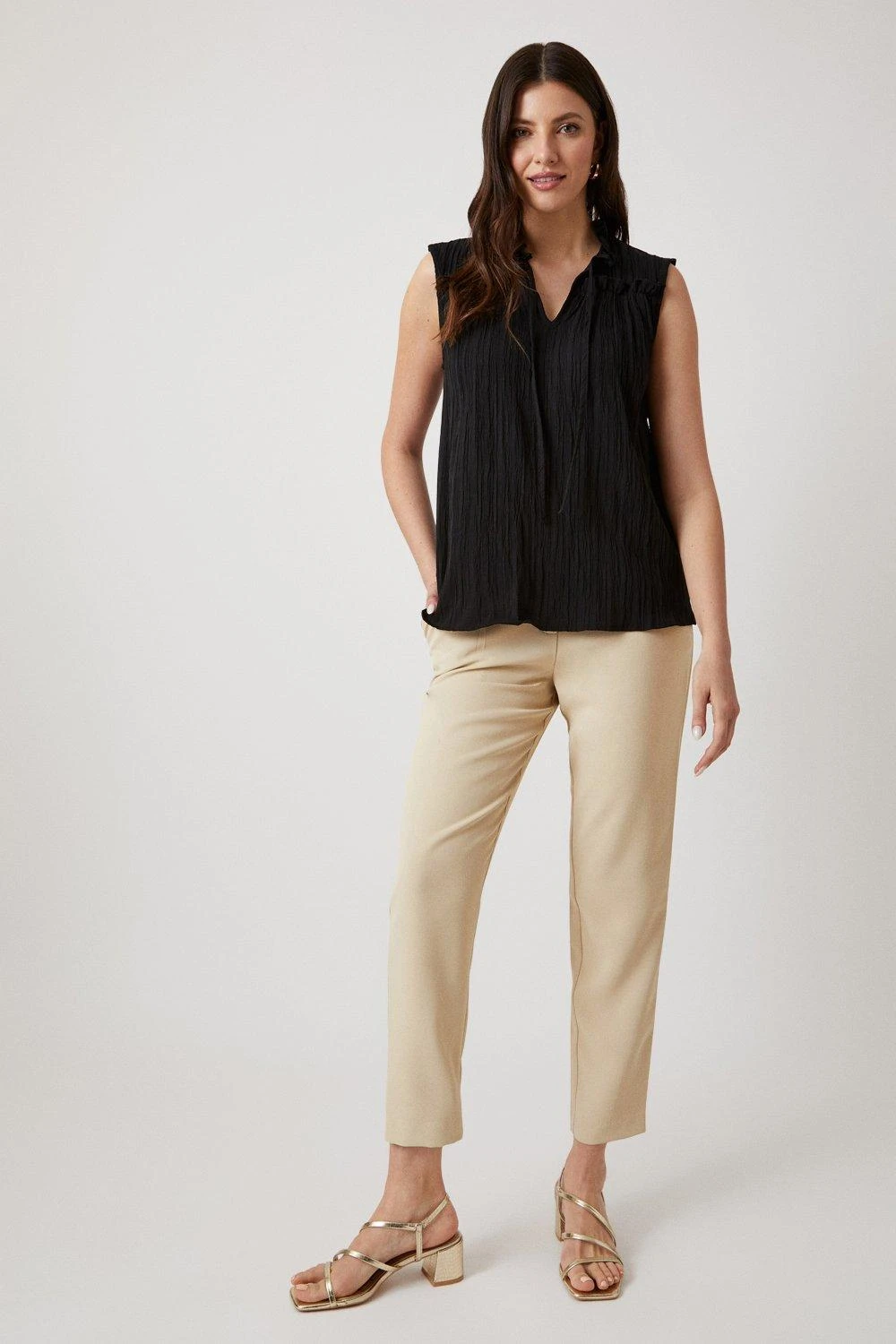 Complete the look with our new season tops. From casual camis to smart office tops to glam ruffled evening styles, we’ve got you covered for whatever you have in the diary. Make a style statement with puff sleeves and bold prints, or keep things classic with a chic cami or ruffles top. Intricate embellishments and fine prints are set to bring your everyday wardrobe to life, whilst a variety of fits are designed to flatter. Style: Black Textured Sleeveless Tie Neck Top. Ideal for: Daywear. Fit: Regular. Design: Tie. Model wears size UK 10 and is 5′ 9″ tall. Make-up & Fragrance: Primer (Benefit, Porefessional Face Primer 22ml), Foundation (Estée Lauder, Futurist Hydra Rescue Moisturizing Foundation SPF45), Mascara (Benefit , Badgal Bang Volumising Mascara 8.5g Pitch Black), Brow Pencil (Benefit, Goof Proof Easy Shape And Fill Brow Pencil 0.3g), Fragrance (Marc Jacobs Daisy Eau De Toilette For Her).