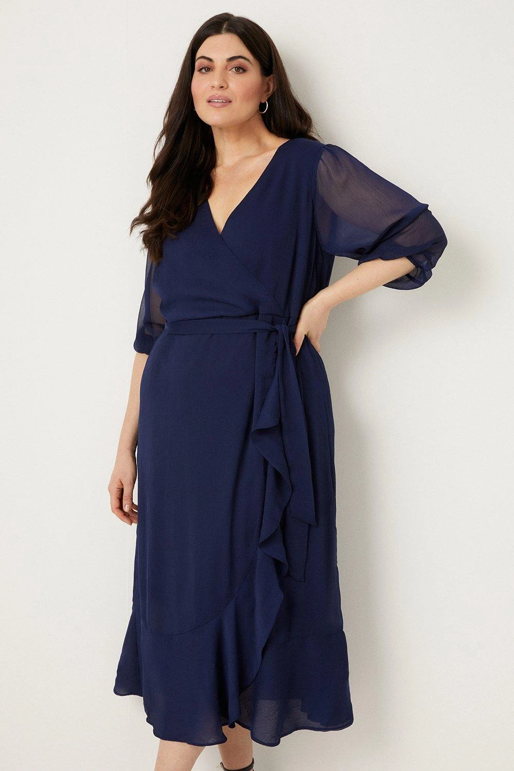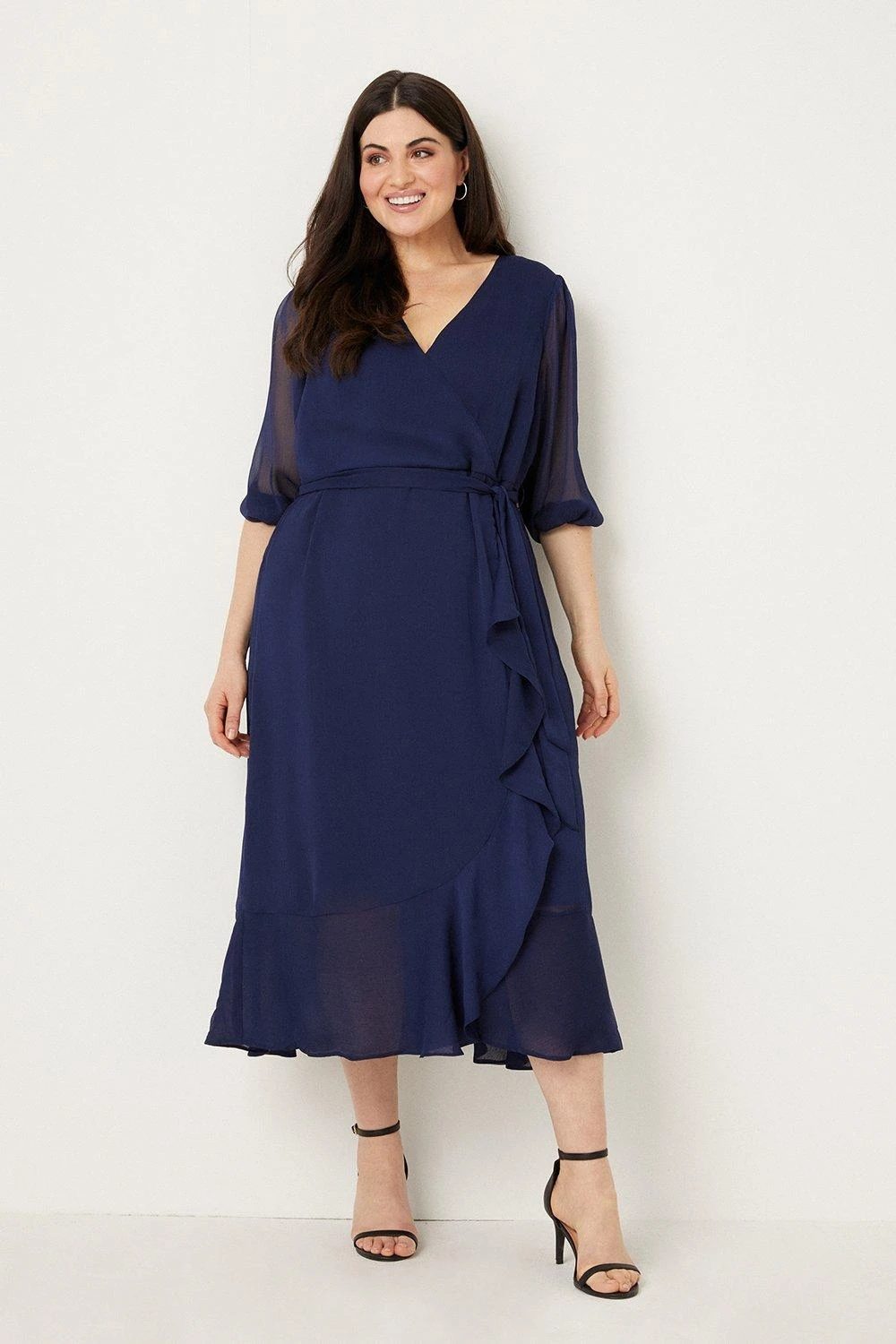 Just say dress. From sophisticated workwear styles to show stopping event-ready designs, our new season dresses have you covered for any and all occasions. Discover unique prints, elegant silhouettes and versatile styles. Whatever you’ve got in the diary, we’ve got the dress for it. Shop versatile Midi dresses, elegant Maxi dresses and everything in between.Style: Curve Navy Chiffon Midi Wrap Dress Ideal for: Daywear Design: Ruffle Model wears size UK 18 and is 5′ 9″ tall Make-up & Fragrance: Primer (Benefit, Porefessional Face Primer 22ml), Foundation (Estée Lauder, Futurist Hydra Rescue Moisturizing Foundation SPF45), Mascara (Benefit , Badgal Bang Volumising Mascara 8.5g Pitch Black), Brow Pencil (Benefit, Goof Proof Easy Shape And Fill Brow Pencil 0.3g), Fragrance (Marc Jacobs Daisy Eau De Toilette For Her).
