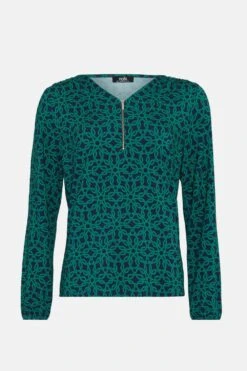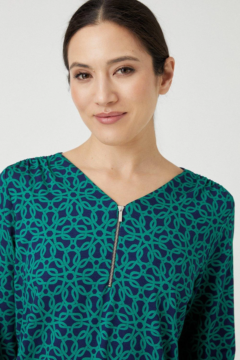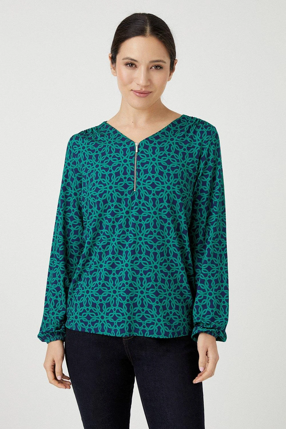 Complete the look with our new season tops. From casual camis to smart office tops to glam ruffled evening styles, we’ve got you covered for whatever you have in the diary. Make a style statement with puff sleeves and bold prints, or keep things classic with a chic cami or ruffles top. Intricate embellishments and fine prints are set to bring your everyday wardrobe to life, whilst a variety of fits are designed to flatter. Style: Green Geo Jersey Zip Top. Ideal for: Daywear. Fit: Regular. Design: Zips. Model wears size UK 10 and is 5′ 9″ tall. Make-up & Fragrance: Primer (Estée Lauder, The Smoother Universal Perfecting Primer + Finisher), Foundation (Estée Lauder, Double Wear Stay in Place Foundation SPF10), Mascara (Lancôme, Hypnôse Custom-Wear Volume Mascara), Bronzer (Estée Lauder, Bronze Goddess Healthy Glow Bronzer), Fragrance (Marc Jacobs, Daisy Eau De Toilette For Her).