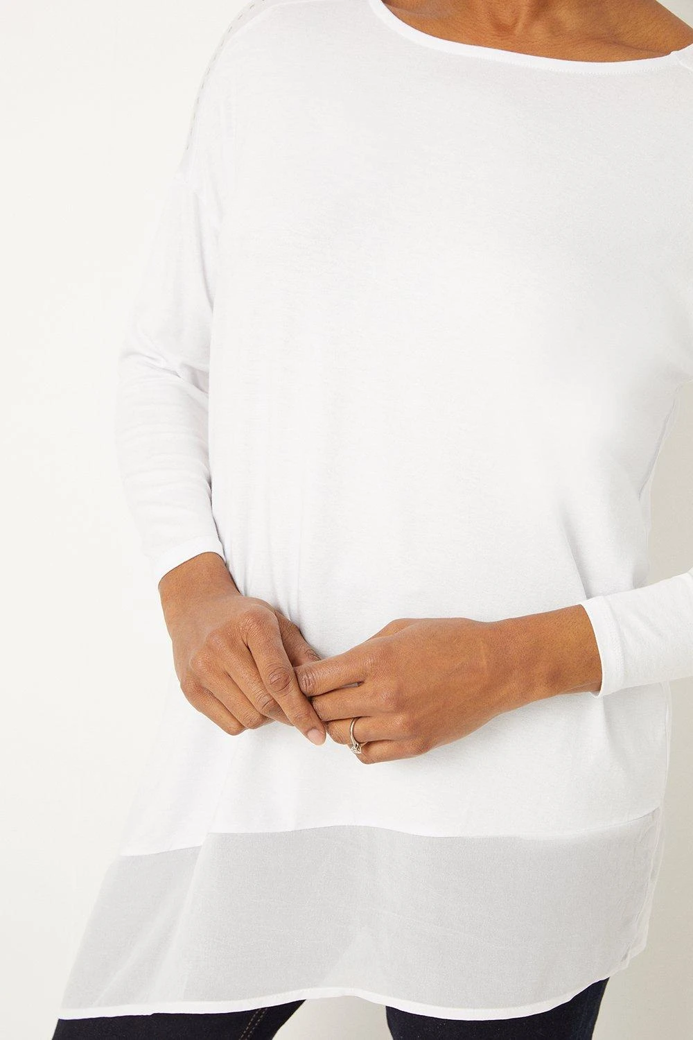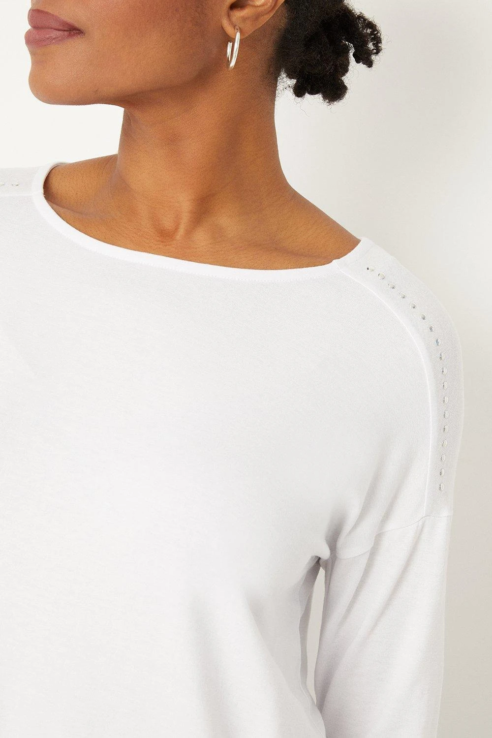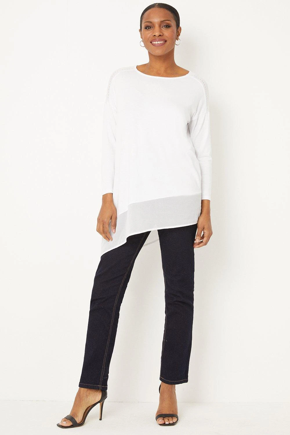 Complete the look with our new season tops. From casual camis to smart office tops to glam ruffled evening styles, we’ve got you covered for whatever you have in the diary. Make a style statement with puff sleeves and bold prints, or keep things classic with a chic cami or ruffles top. Intricate embellishments and fine prints are set to bring your everyday wardrobe to life, whilst a variety of fits are designed to flatter.Style: Ivory Studded Jersey Asymmetric Top Ideal for: Daywear Fit: Regular Design: Asymmetric Model wears size UK 10 and is 5′ 9″ tall Make-up & Fragrance: Primer (Estée Lauder, The Mattifier Shine Control Perfecting Primer + Finisher), Foundation (Estée Lauder, Double Wear Stay in Place Foundation SPF10), Concealer (Estée Lauder Double Wear Stay-In-Place Flawless Wear Concealer), Bronzer (Benefit, Hoola Matte Powder Bronzer), Blusher (Lancôme, Blush Subtil Powder Blusher with Brush), Mascara (Benefit, They’Re Real Lengthening Mascara Jet Black 8.5g), Fragrance (Lancôme, La Vie est Belle Eau de Parfum).