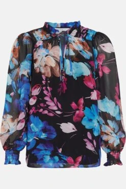 Multi Large Floral Tie Neck Blouse