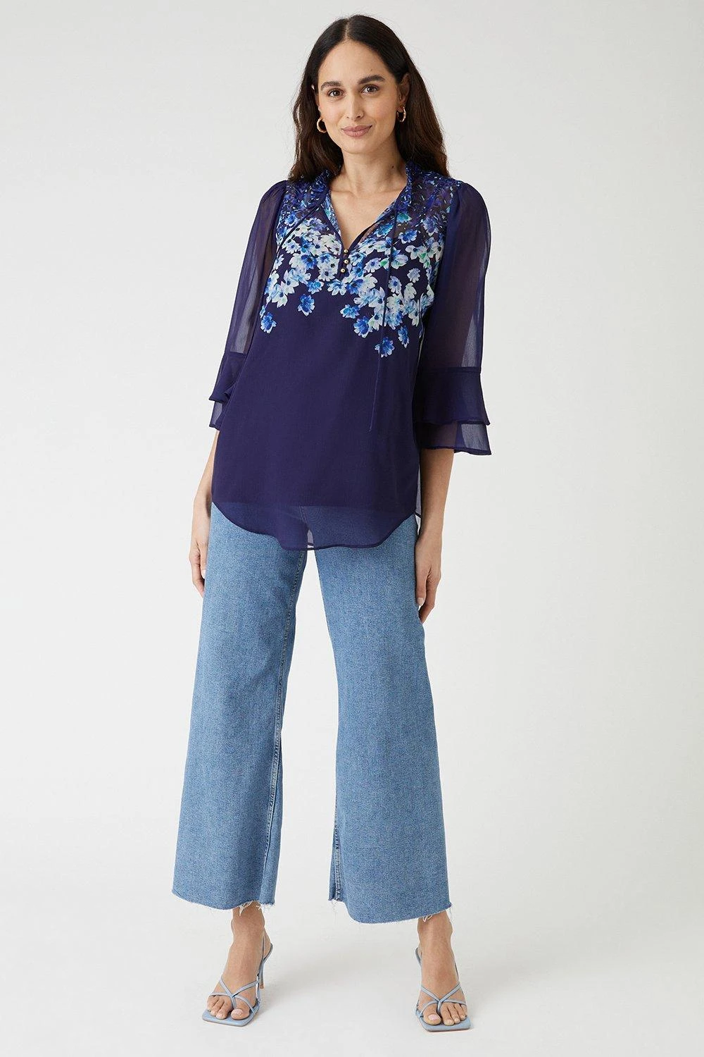 Complete the look with our new season tops. From casual camis to smart office tops to glam ruffled evening styles, we’ve got you covered for whatever you have in the diary. Make a style statement with puff sleeves and bold prints, or keep things classic with a chic cami or ruffles top. Intricate embellishments and fine prints are set to bring your everyday wardrobe to life, whilst a variety of fits are designed to flatter. Style: Navy Floral Border Tie Neck Blouse. Ideal for: Daywear. Fit: Loose. Design: Ruffle. Model wears size UK 10 and is 5′ 9″ tall. Make-up & Fragrance: Primer (Yves Saint Laurent, Touche Eclat Blur Primer 30ml), Foundation (Yves Saint Laurent, New All Hours Foundation), Blusher (Estée Lauder, Pure Color Envy Sculpting Blush), Mascara (Lancôme, Hypnôse Custom-Wear Volume Mascara), Setting Spray (Urban Decay, All Nighter Setting Spray 118ml), Fragrance (Valentino, Born In Roma Eau De Parfum).This garment is READY FOR THE FUTURE.Recycled fibres can be used for a number of materials including polyester, cotton and acrylic. They are a more sustainable alternative, as they take less energy, land and water to make than virgin fibres, and are often derived from products that would otherwise have gone to wasteFind out more about our sustainability guidelines and goals.
