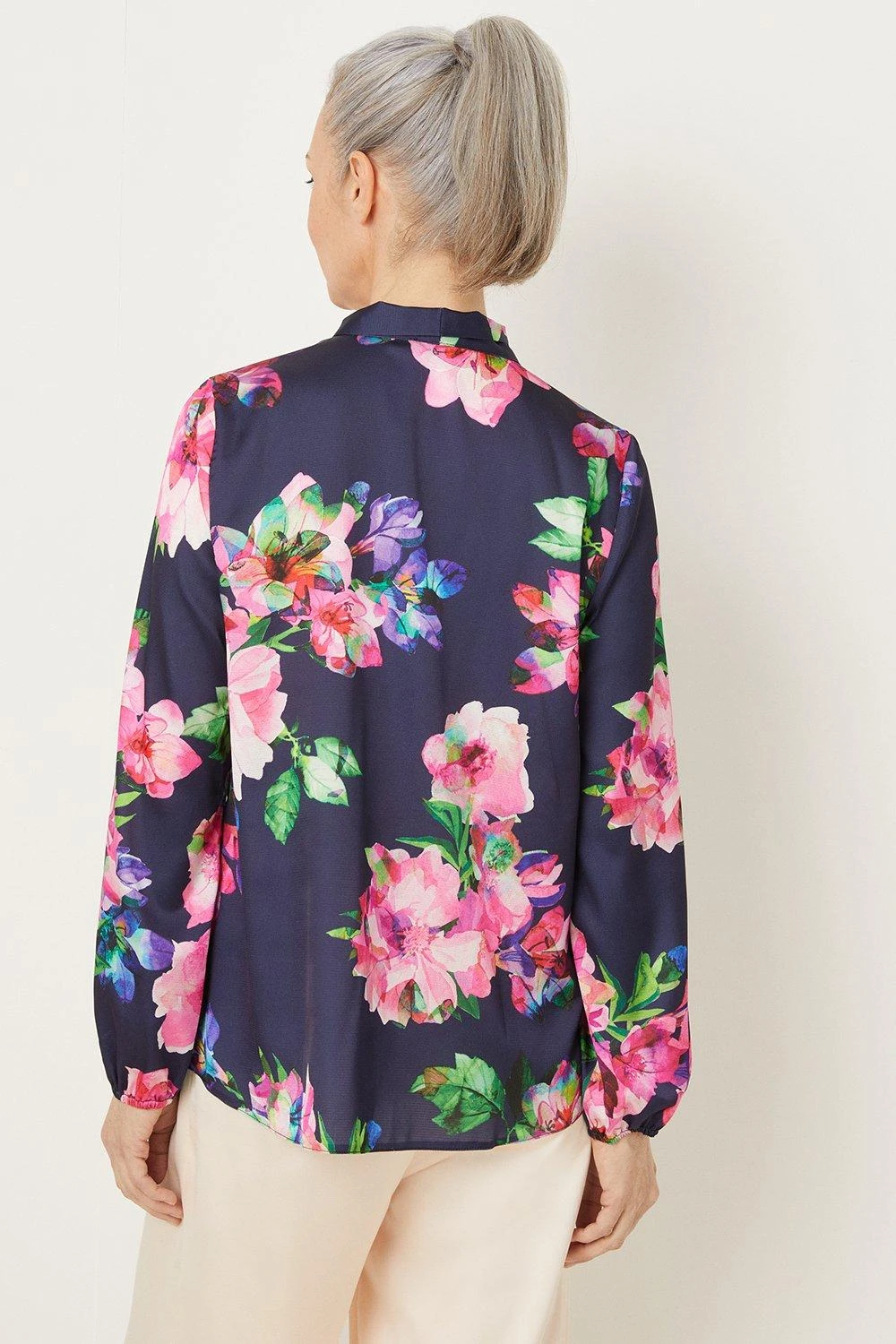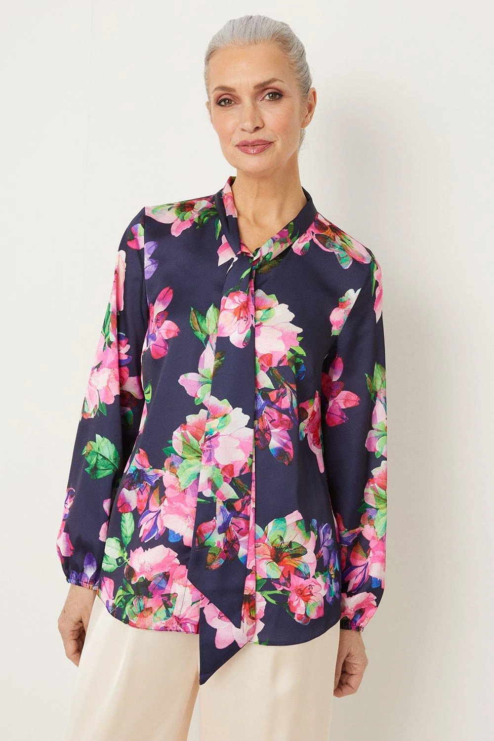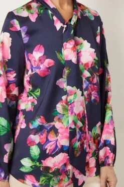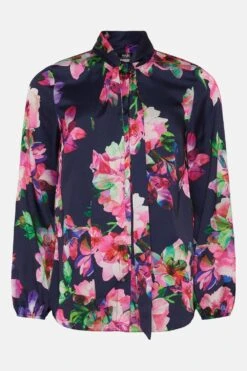 Navy Floral Tie Neck Blouse