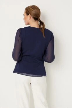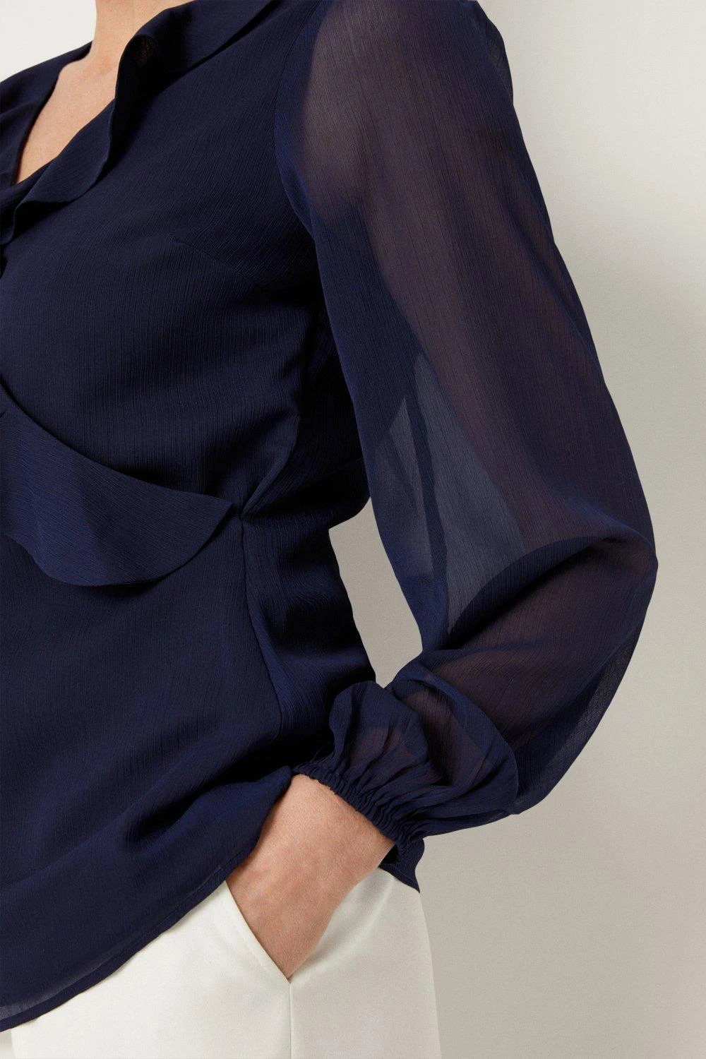 Complete the look with our new season tops. From casual camis to smart office tops to glam ruffled evening styles, we’ve got you covered for whatever you have in the diary. Make a style statement with puff sleeves and bold prints, or keep things classic with a chic cami or ruffles top. Intricate embellishments and fine prints are set to bring your everyday wardrobe to life, whilst a variety of fits are designed to flatter.Style: Navy Ruffle Wrap Top Ideal for: Daywear Fit: Regular Design: Ruffle Model wears size UK 10 and is 5′ 9″ tall Make-up & Fragrance: Primer (Estée Lauder, The Mattifier Shine Control Perfecting Primer + Finisher), Foundation (Estée Lauder, Double Wear Stay in Place Foundation SPF10), Concealer (Estée Lauder Double Wear Stay-In-Place Flawless Wear Concealer), Bronzer (Benefit, Hoola Matte Powder Bronzer), Blusher (Lancôme, Blush Subtil Powder Blusher with Brush), Mascara (Benefit, They’Re Real Lengthening Mascara Jet Black 8.5g), Fragrance (Lancôme, La Vie est Belle Eau de Parfum).This garment is READY FOR THE FUTURE.Recycled fibres can be used for a number of materials including polyester, cotton and acrylic. They are a more sustainable alternative, as they take less energy, land and water to make than virgin fibres, and are often derived from products that would otherwise have gone to wasteFind out more about our sustainability guidelines and goals.