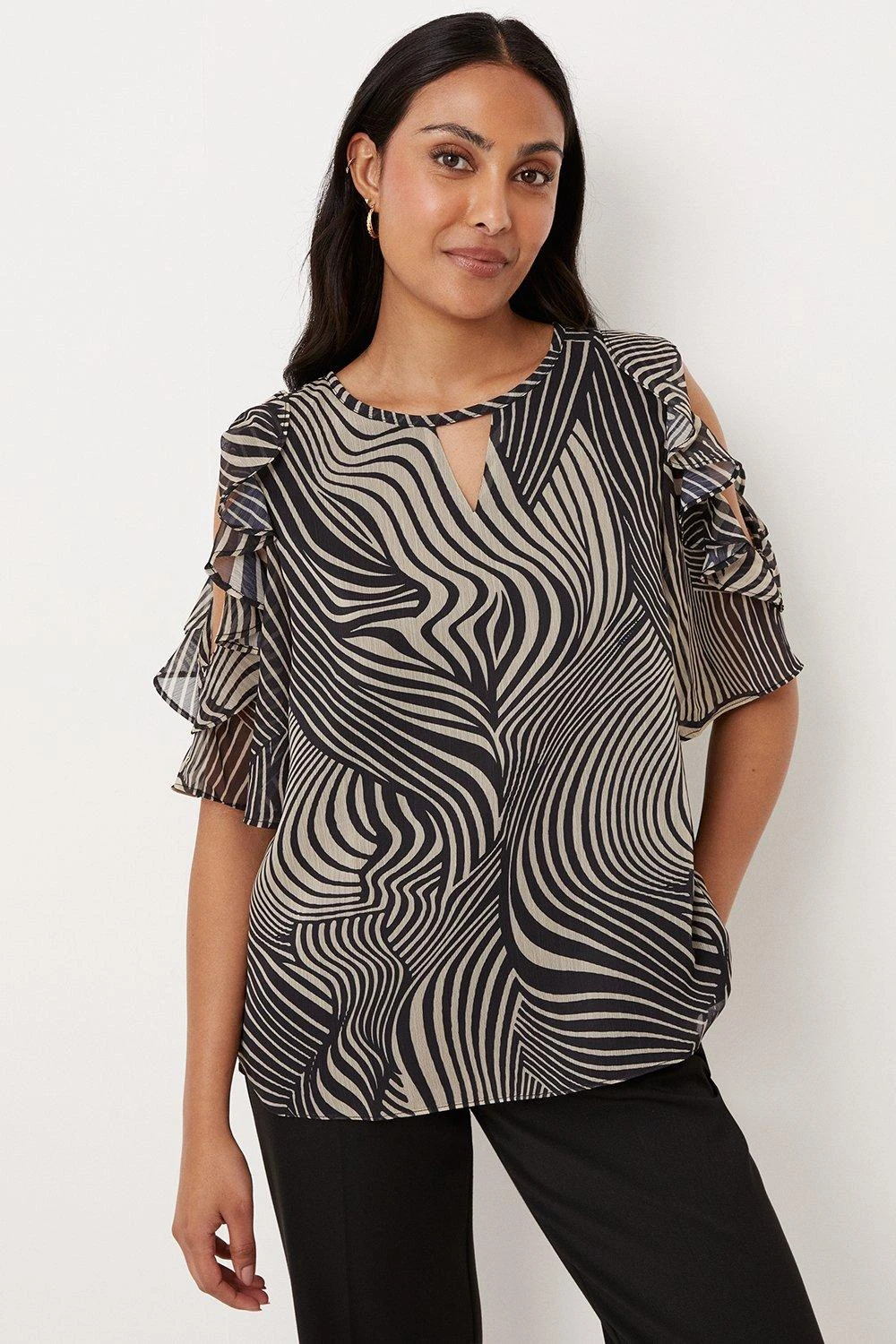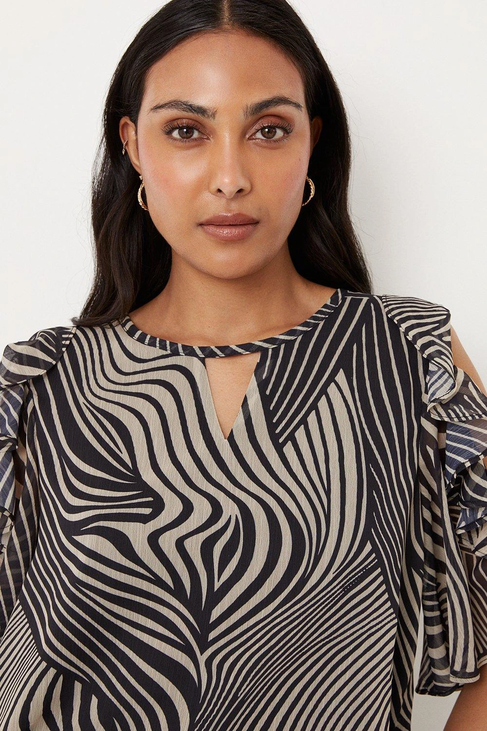 Complete the look with our new season tops. From casual camis to smart office tops to glam ruffled evening styles, we’ve got you covered for whatever you have in the diary. Make a style statement with puff sleeves and bold prints, or keep things classic with a chic cami or ruffles top. Intricate embellishments and fine prints are set to bring your everyday wardrobe to life, whilst a variety of fits are designed to flatter. Style: Petite Mono Linear Swirl Cold Shoulder Top. Ideal for: Daywear. Design: Ruffle. Model wears size UK 10 and is 5′ 3″ tall. Make-up & Fragrance: Primer (Yves Saint Laurent, Touche Eclat Blur Primer 30ml), Foundation (Yves Saint Laurent, New All Hours Foundation), Blusher (Estée Lauder, Pure Color Envy Sculpting Blush), Mascara (Lancôme, Hypnôse Custom-Wear Volume Mascara), Setting Spray (Urban Decay, All Nighter Setting Spray 118ml), Fragrance (Valentino, Born In Roma Eau De Parfum).