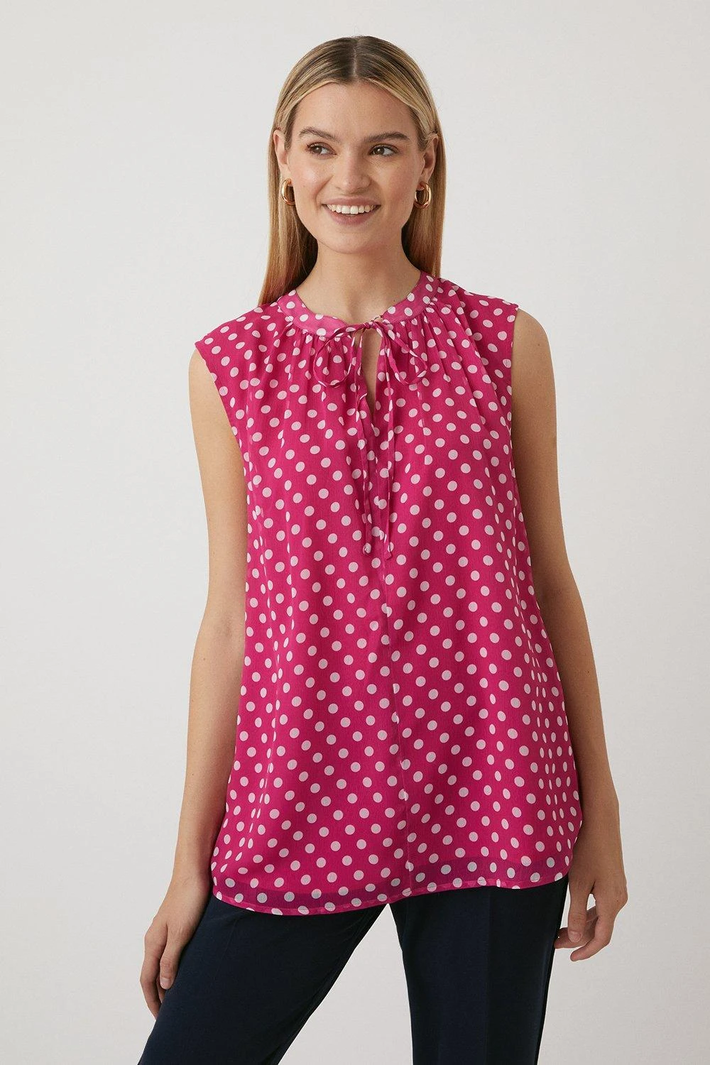 Be the first to review “Wallis Tall Magenta Spot Sleeveless Tie Neck Top” Cancel reply