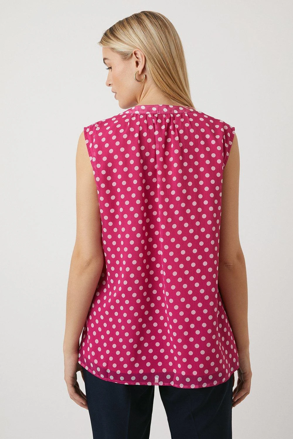 Complete the look with our new season tops. From casual camis to smart office tops to glam ruffled evening styles, we’ve got you covered for whatever you have in the diary. Make a style statement with puff sleeves and bold prints, or keep things classic with a chic cami or ruffles top. Intricate embellishments and fine prints are set to bring your everyday wardrobe to life, whilst a variety of fits are designed to flatter. Style: Tall Magenta Spot Sleeveless Tie Neck Top. Ideal for: Daywear. Fit: Regular. Design: All Over Print. Model wears size UK 10 and is 5′ 11″ tall. Make-up & Fragrance: Primer (Yves Saint Laurent, Touche Eclat Blur Primer 30ml), Foundation (Yves Saint Laurent, New All Hours Foundation), Blusher (Estée Lauder, Pure Color Envy Sculpting Blush), Mascara (Lancôme, Hypnôse Custom-Wear Volume Mascara), Setting Spray (Urban Decay, All Nighter Setting Spray 118ml), Fragrance (Valentino, Born In Roma Eau De Parfum).This garment is READY FOR THE FUTURE.Recycled fibres can be used for a number of materials including polyester, cotton and acrylic. They are a more sustainable alternative, as they take less energy, land and water to make than virgin fibres, and are often derived from products that would otherwise have gone to wasteFind out more about our sustainability guidelines and goals.