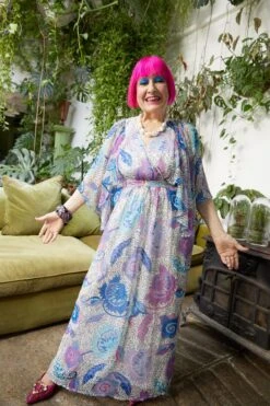 Zandra Rhodes x Friends of Wallis Jungle Flower Cape Midaxi Dress. Taking inspiration from nature and replicating beautiful prints and patterns, this midaxi dress feature breezy batwing sleeves and a cinched waist to loosely frame the silhouette. Zandra sees this style being worn for summer weddings, and on summer evenings, and of course, on the beach as you can dress it up or down so easily.