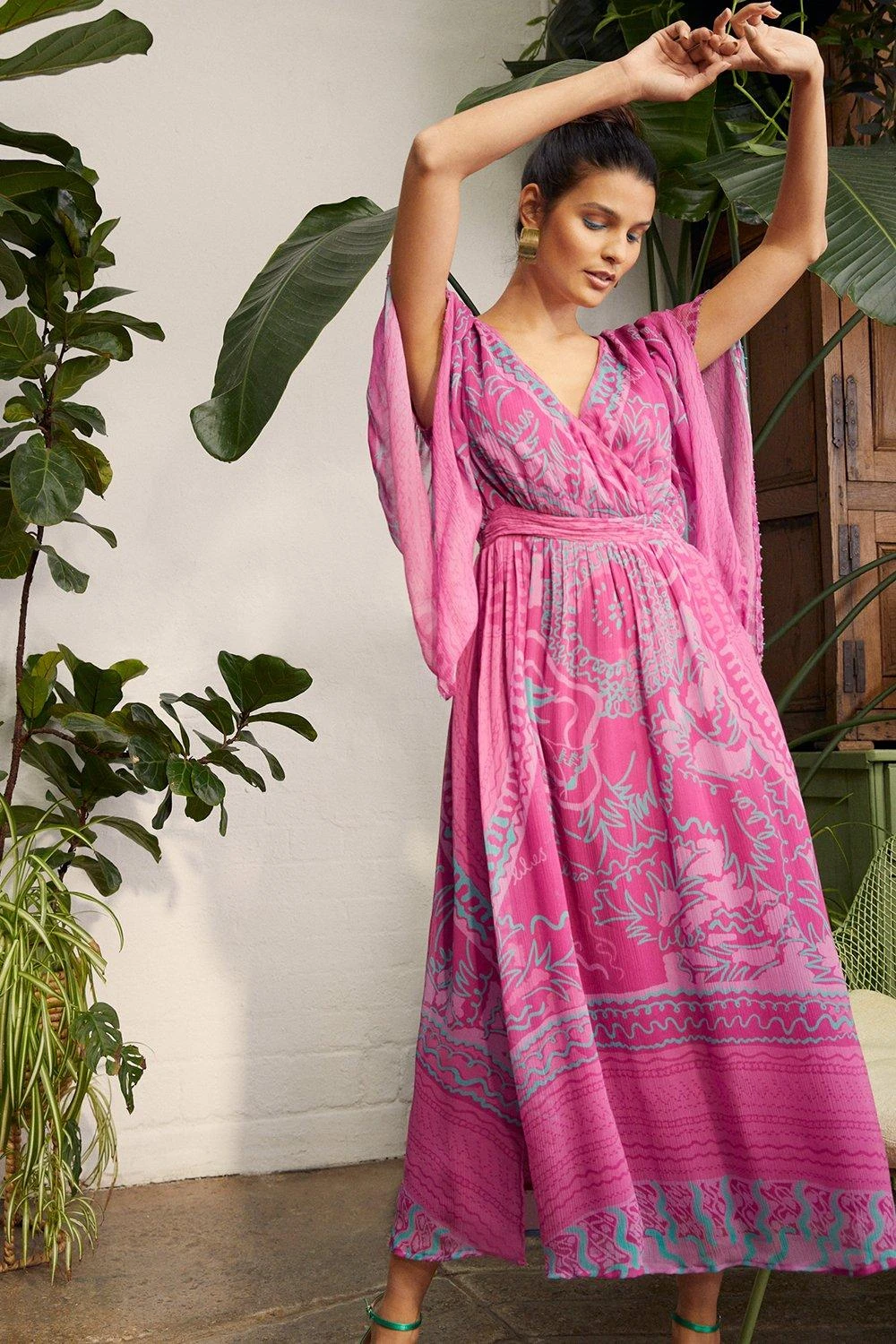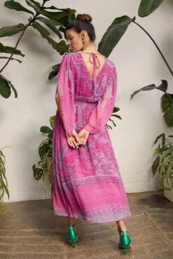 Zandra Rhodes x Friends of Wallis Lilies Split Sleeve Midaxi Dress. Intricate florals meet a layered pattern, creating dimension and a feminine feel to this dress. Carefully crafted to exhibit its beautiful print, flowing lines and cascading hems contribute to the overarching aesthetic. Designs like this remind us of Zandra’s essence, as she wants to encourage people to dress up, feel lovely and be colourful.